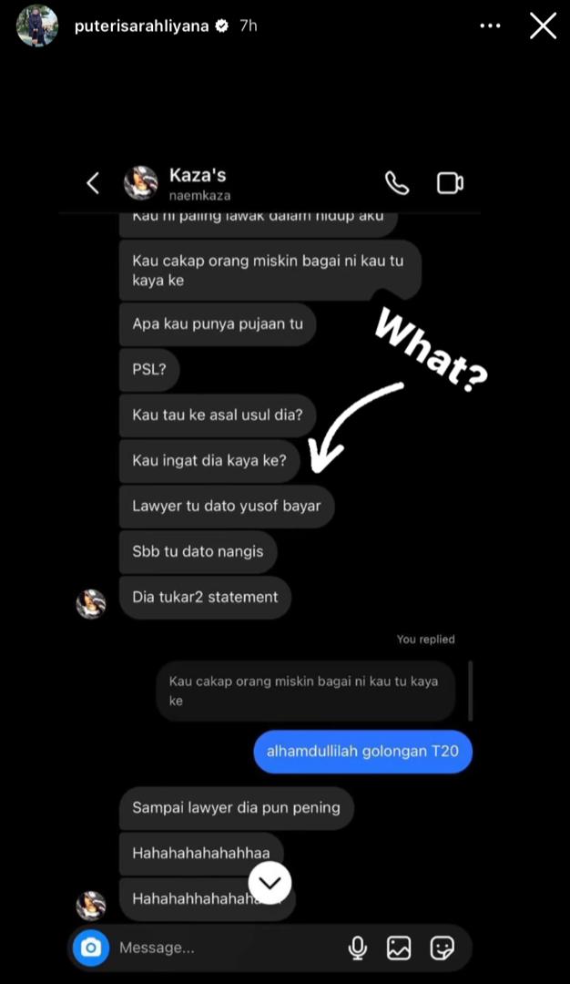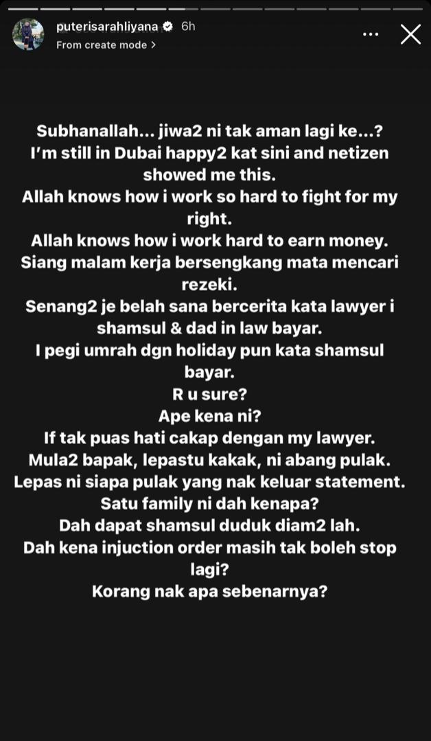 Pelakon, Puteri Sarah mendedahkan dirinya telah dituduh menggunakan wang daripada suaminya, Syamsul Yusof dan bapa mentua, Datuk Yusof Haslam untuk membayar khidmat peguamnya.