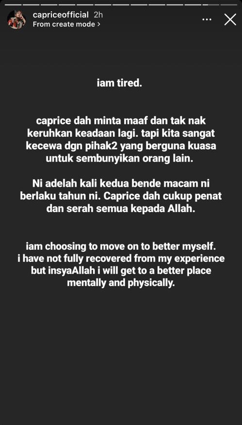 "Saya sudah penat." Itulah kata-kata bintang rap Caprice yang dikongsi menerusi Instagram Story malam tadi.