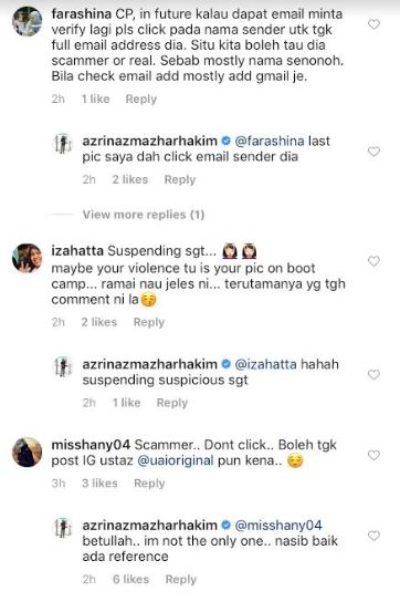 Rata-rata pengikutnya menasihati supaya tidak mengikut arahan yang dihantar serta meminta Azrinaz membuat laporan kepada pihak Instagram.