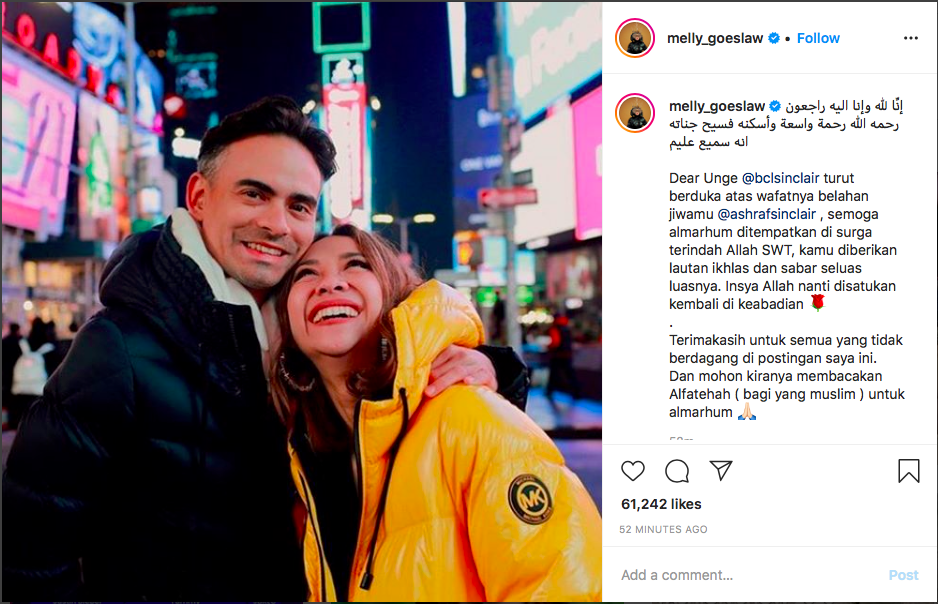 "Terimakasih untuk semua yang tidak berdagang di postingan saya ini. Dan mohon kiranya membacakan Alfatehah ( bagi yang muslim ) untuk almarhum," tulis Melly sekitar 45 menit lalu.