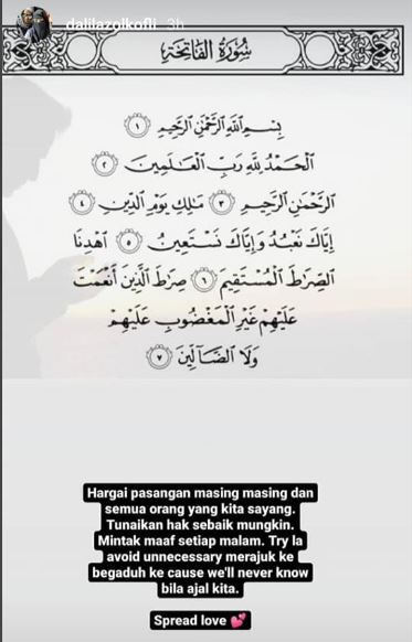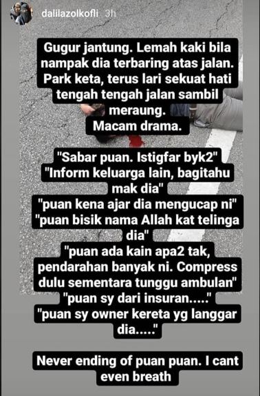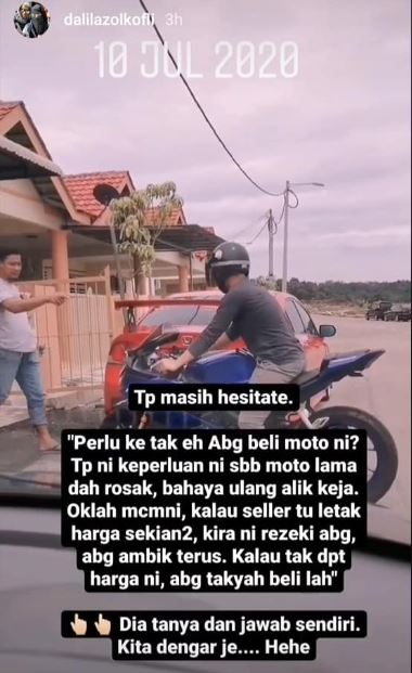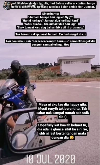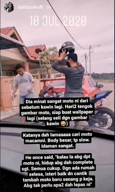Tular di media sosial sejak semalam, coretan isteri bernama Dalila Zolkofli (seorang doktor pergigian di Klinik Pergigian Kurnia, Kuantan) yang merakamkan momen-momen terakhir perjalanan Allahyarham suaminya, Faizal Gani sebelum menemui ajal akibat kemalangan jalanraya. Lebih memilukan, detik itu berlaku selepas 20 minit Allahyarham Faizal membeli motosikal baru yang telah lama diimpikannya sebelum ini. Dan semua momen itu dirakam Dalila dalam muat naik Instastory juga dikongsikan di akaun facebooknya sebagai kenangan abadi dan terakhir mereka.