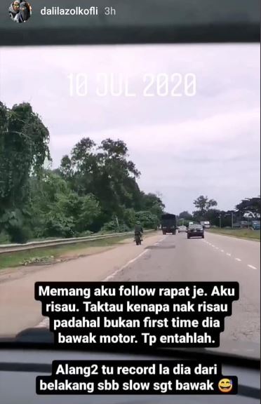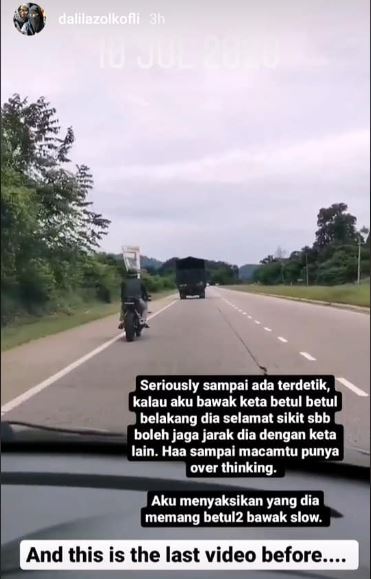 Dalila terus ‘menemani’ suaminya sepanjang perjalanan usai dari mengambi motosikal dari rumah penjual menuju pulang ke rumah mereka. Dia juga menjadi saksi bahawasanya suaminya memandu perlahan di lorong tepi hingga membolehkan Dalila terus merakam momen yang tidak disangka menjadi detik akhir memisahkan mereka. Dan entah kenapa, terdetik dihati si isteri betapa dia cukup risau ketika itu. Suatu perasaan dan rasa bimbang yang tidak pernah dirasakannya sebelum ini. Hinggakan terlintas difikirannya agar terus berada di belakang suami bagi membolehkan adanya jarak motosikal yang ditunggang suami dengan kenderaan lain. Allahu… sungguh unik dan istimewanya naluri si isteri ini. Seolah-olah sudah ‘terasa’ sesuatu tetapi tidak pasti apa yang akan berlaku seterusnya.
