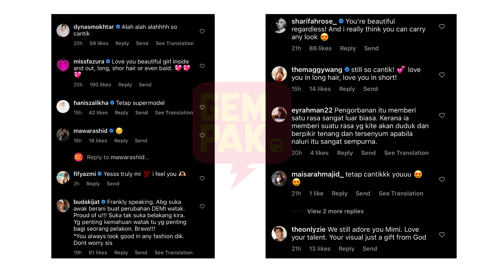Sementara itu, diruangan balas, ramai yang memuji penampilan Mimi yang kelihatan lebih cantik berambut pendek termasuk beberapa rakan selebriti seperti Fazura, Ziana Zain dan Sharifah Rose.