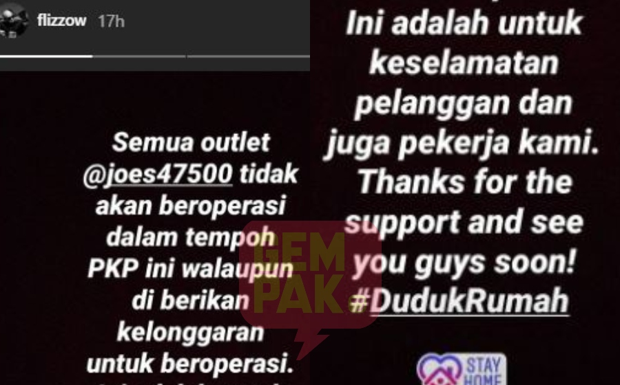 “Semua outlet @joes47500 tidak akan beroperasi dalam tempoh PKP ini walaupun diberikan kelonggaran untuk beroperasi.