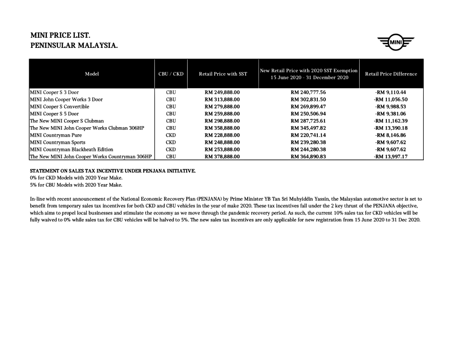 Ini pula senarai harga untuk model MINI. Namun semua adalah versi import yang mana ia menerima pengecualian cukai sebanyak 50 peratus berbanding 100 peratus untuk pemasangan tempatan.