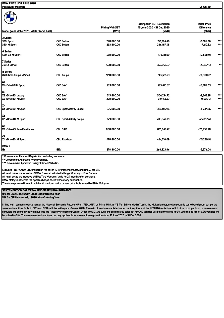 Pengurangan yang paling banyak adalah bagi model BMW 840i Gran Coupe M Sport dengan RM31,388.77. Kini ia dijual pada harga RM937,411 berbanding sebelum ini iaitu RM968,800.