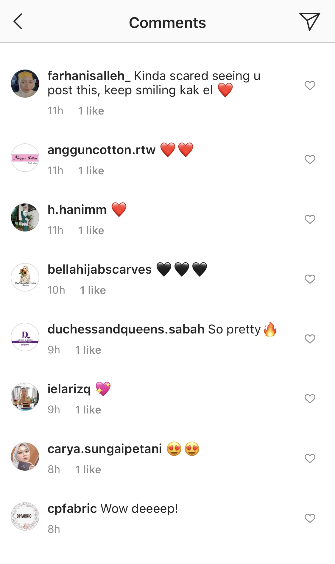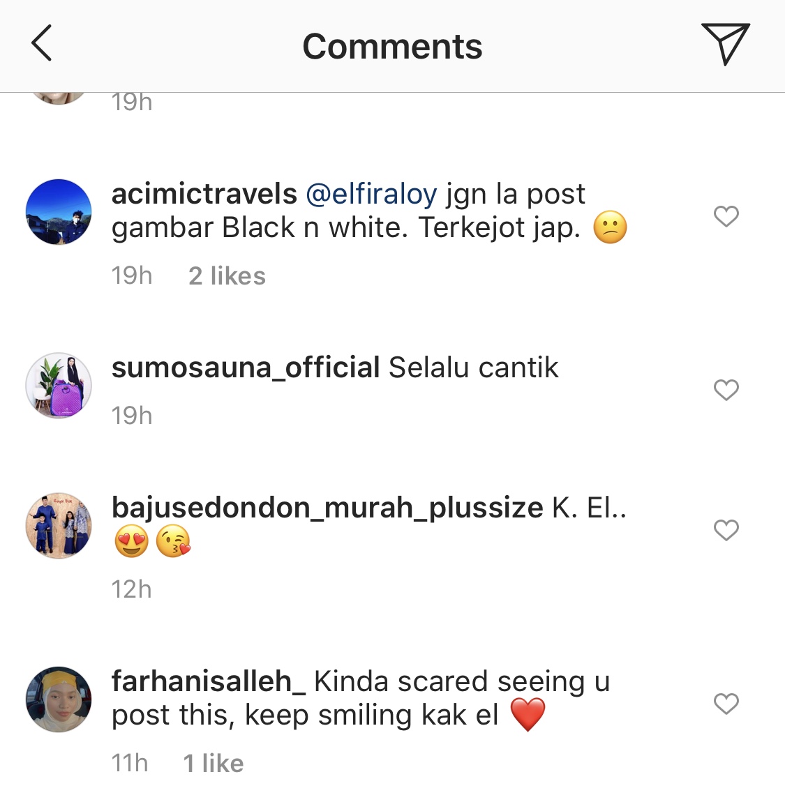 "Terkejut bila tengok post macam ni, teruskan senyum Kak El," tulis beberapa wargamaya.