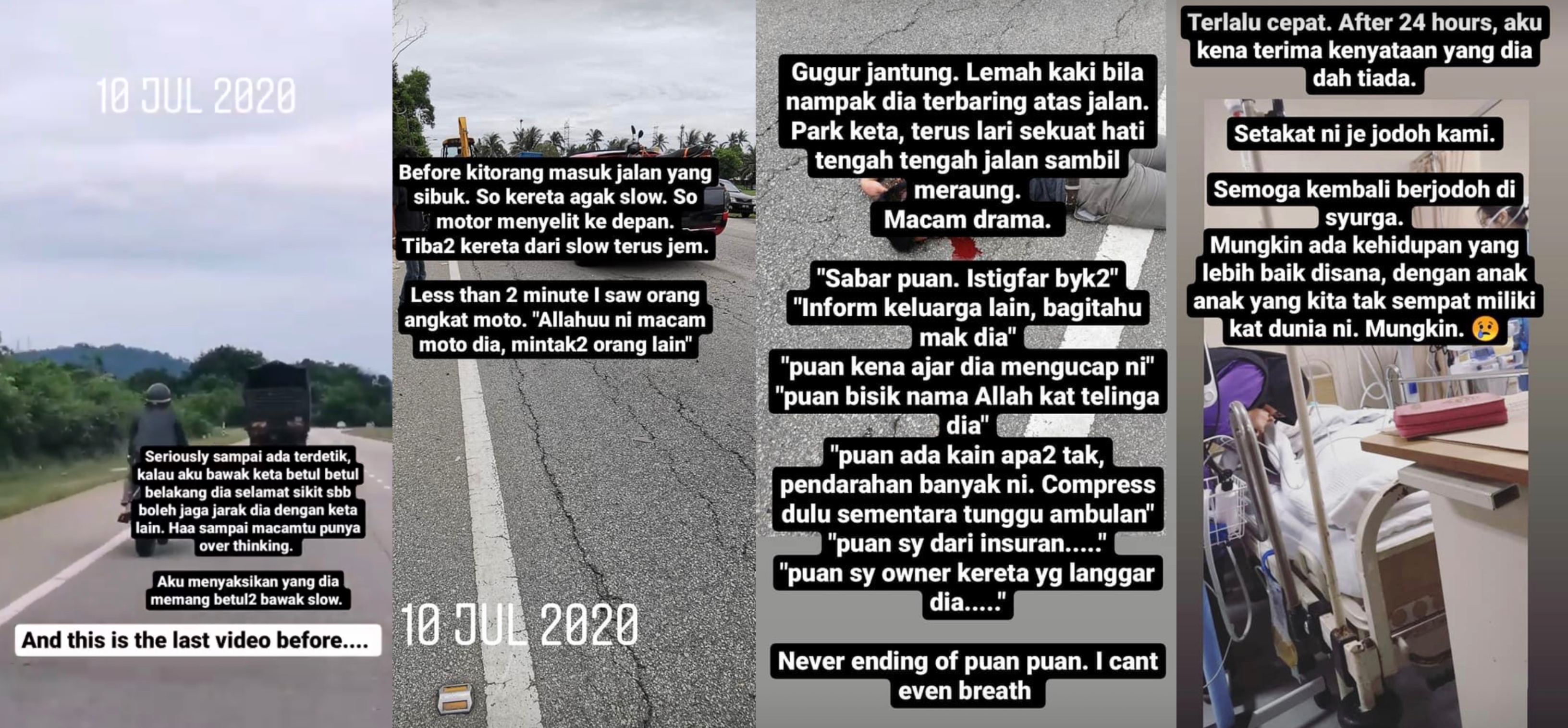 "Jadi motosikal menyelit ke depan. Tiba-tiba kereta dari perlahan terus sesak. Kurang dari 2 minit saya nampak orang angkat motosikal. Allahu ni macam motosikal dia, minta-minta orang lain.
