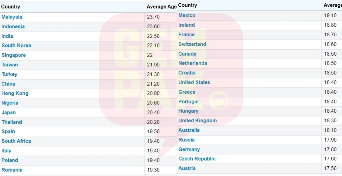 Carta usia World Population Review mendedahkan purata pemuda hilang teruna sekitar 17 hingga 20 tahun.