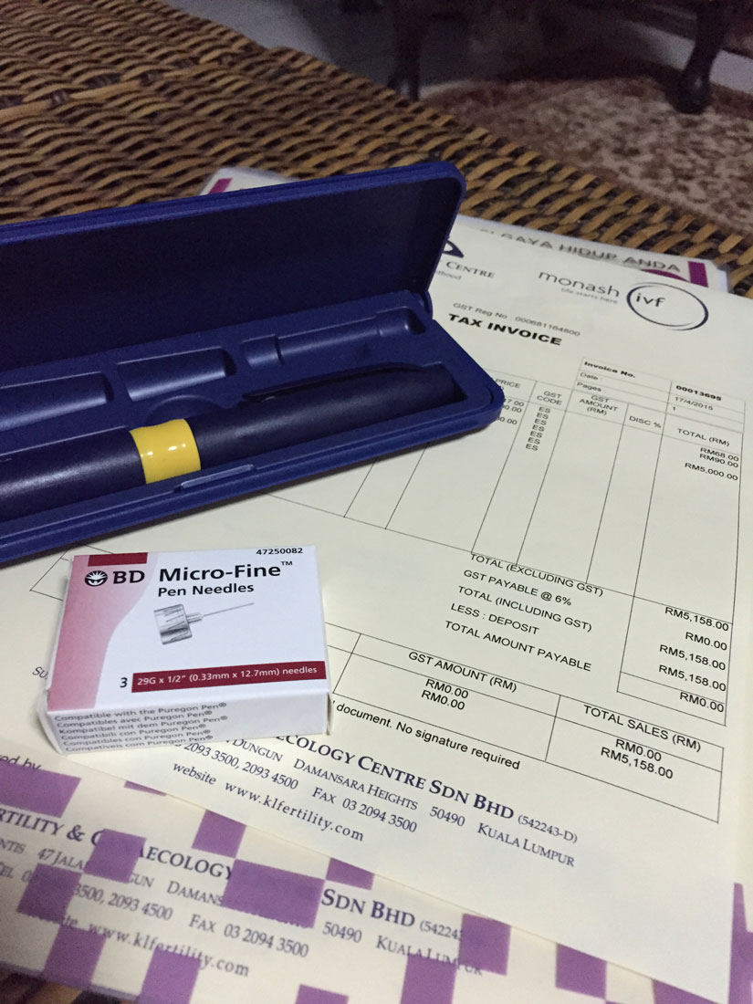 Sebahagian proses rawatan IFV yang memerlukan saya melakukan suntikan di rumah. Ini hanya sebahagian kecil kos rawatan yang dikenakan.