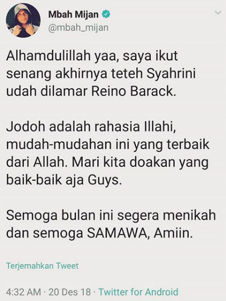 Menerusi kicauannya pada Rabu, 19 Desember 2018: “Alhamdulillah yaa, saya ikut senang akhirnya teteh Syahrini udah dilamar Reino Barack.