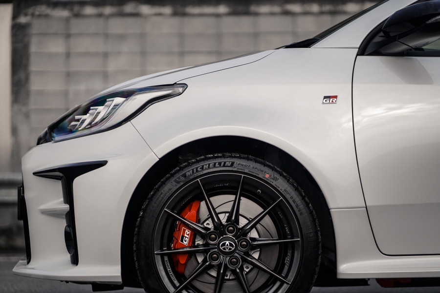 GR Yaris dilengkapi dengan rim aloi 18 inci dengan tayar Michelin Pilot 4S bersaiz 225/40R18 iaitu eksklusif untuk Performance Pack Edition. Lencana khas GR juga menghiasi bumpar depan, fender depan dan pintu belakang.