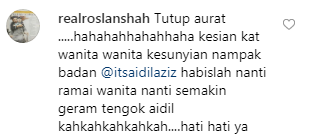 "Tutup aurat. Kesian dekat wanita-wanita kesunyian nampak badan @itsaidilaziz habislah nanti ramai wanita nanti semakin geram tengok aidil kahkah. Hati-hati ya," tulisnya secara berseloroh.