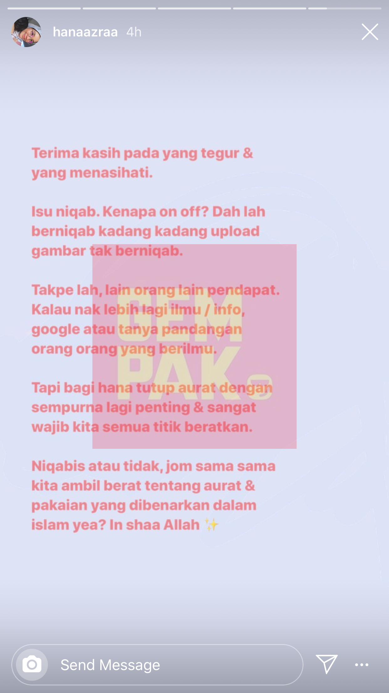 "Terima kasih pada yang tegur dan menasihati. Isu niqab, kenapa on off? Dah lah berniqab kadang-kadang upload gambar tak berniqab.