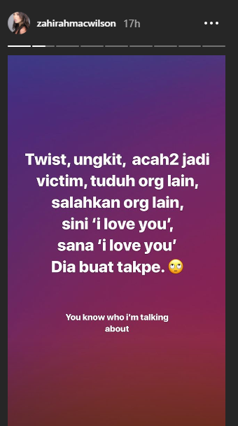 Menerusi Instagram (IG) Story Zahirah, seperti memerli Zul namun tidak menyebut mana-mana nama.