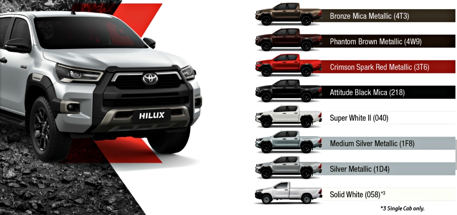 Pelanggan juga boleh memilih tujuh warna luaran bagi Hilux 2020 menerusi Bronze Mica Metallic (warna baharu), Crimson Spark Red Metallic, Attitude Black Mica, Phantom Brown Metallic, Medium Silver Metallic, Silver Metallic dan Super White II. Bagi Hilux Single Cab, ia hanya ditawarkan dengan warna putih sahaja.