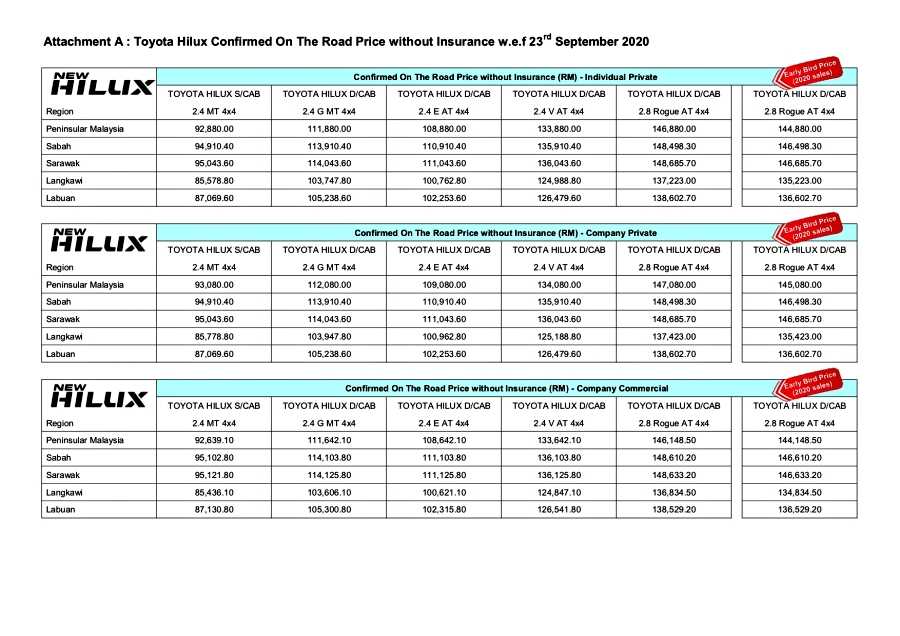 Sempenan pelancaran Toyota Hilux versi 2020 tidak lama lagi, UMW Toyota Motor Sdn Bhd mengumumkan harga jentera itu bermula RM92,880 sehingga RM146,880.