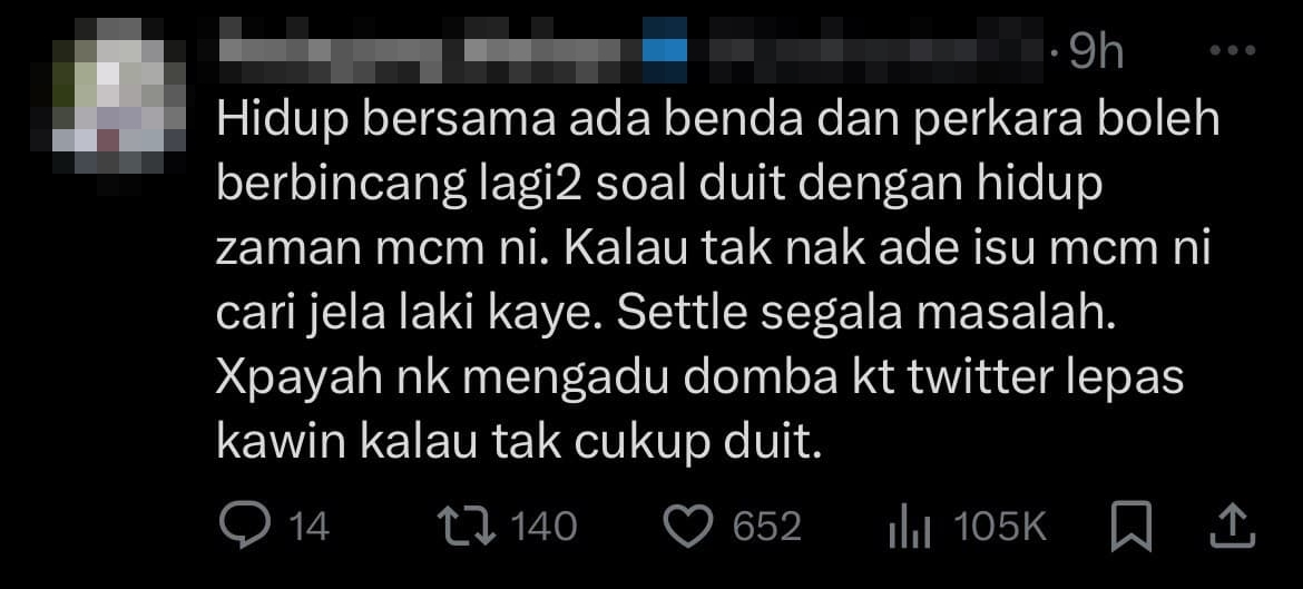 “Bayangkan kau nak kahwin jadi lelaki boleh lah provide rumah untuk kau, sekali lelaki tu minta kau bayar separuh. Baik tak payah kahwin kan,” tulisnya.