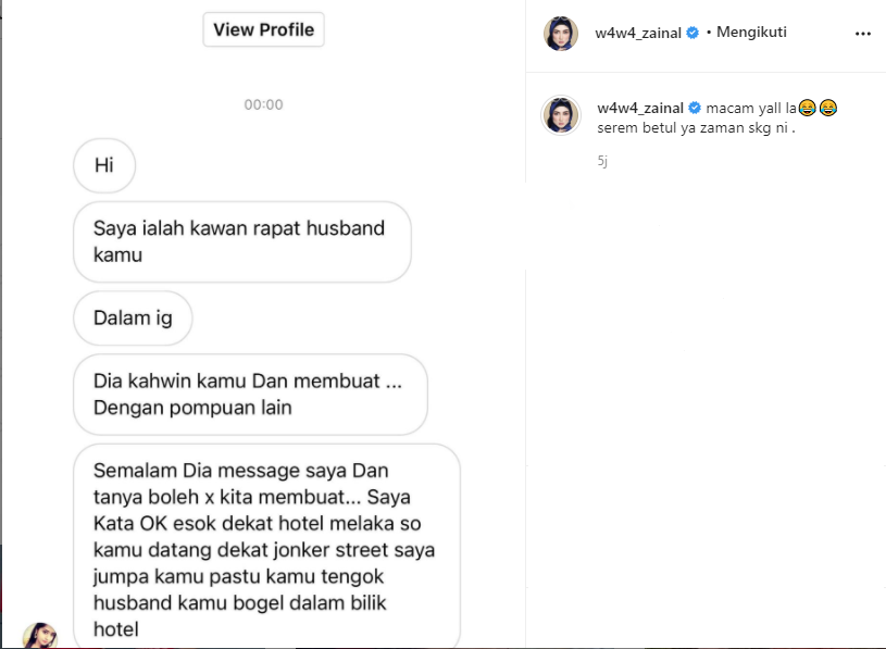 "Hi. Saya ialah kawan rapat suami kamu dalam Instagram (IG). Dia kahwin kamu dan 'membuat' dengan perempuan lain.