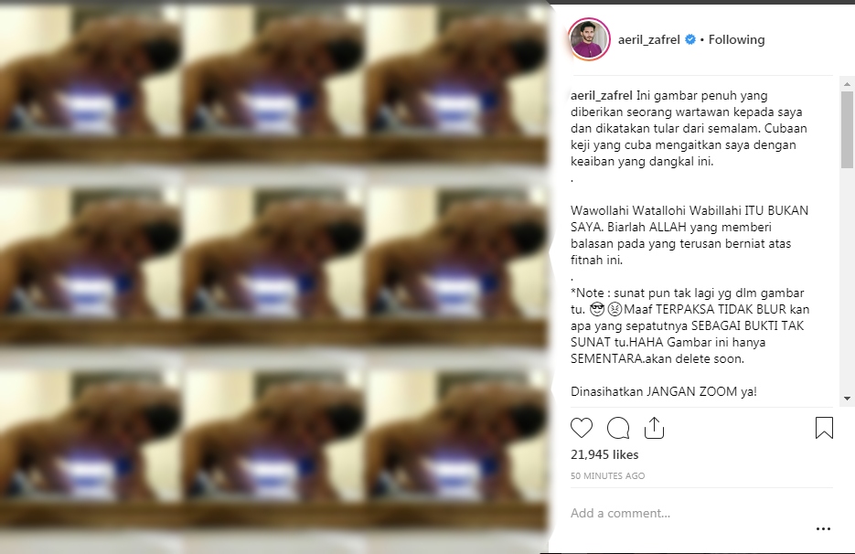 Menerusi entri di laman Instagram (IG), Aeril meluahkan rasa kesal apabila ada pihak yang cuba untuk melakukan fitnah terhadap dirinya dengan menyebarkan gambar tersebut.