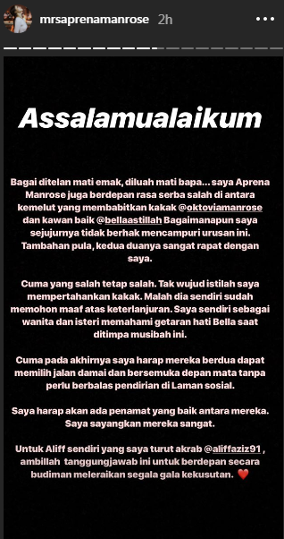 "Bagai ditelan mati emak, diluah mati bapa. Saya Aprena Manrose juga berdepan rasa serba salah diantara kemelut yang membabitkan kakak, Oktovia Manrose dan kawan baik Bella Astillah.