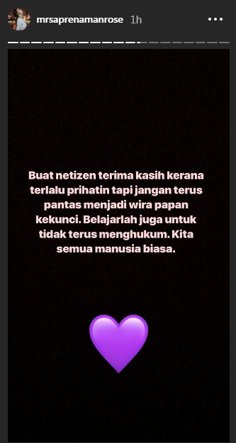 "Buat netizen terima kasih kerana terlalu prihatin tapi jangan terus pantas menjadi wira papan kekunci. Belajarlah juga untuk tidak terus menghukum. Kita semua manusia biasa," tulisnya.