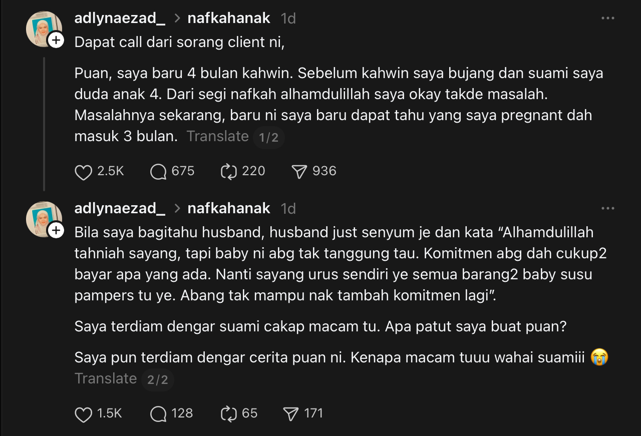 Menerusi hantaran dibuat, peguam yang dikenali sebagai Adlyna Ezad memaklumkan bahawa pada awalnya urusan nafkah melibatkan kliennya tidak mempunyai sebarang masalah namun konflik mula tercetus apabila dirinya disahkan hamil tiga bulan.