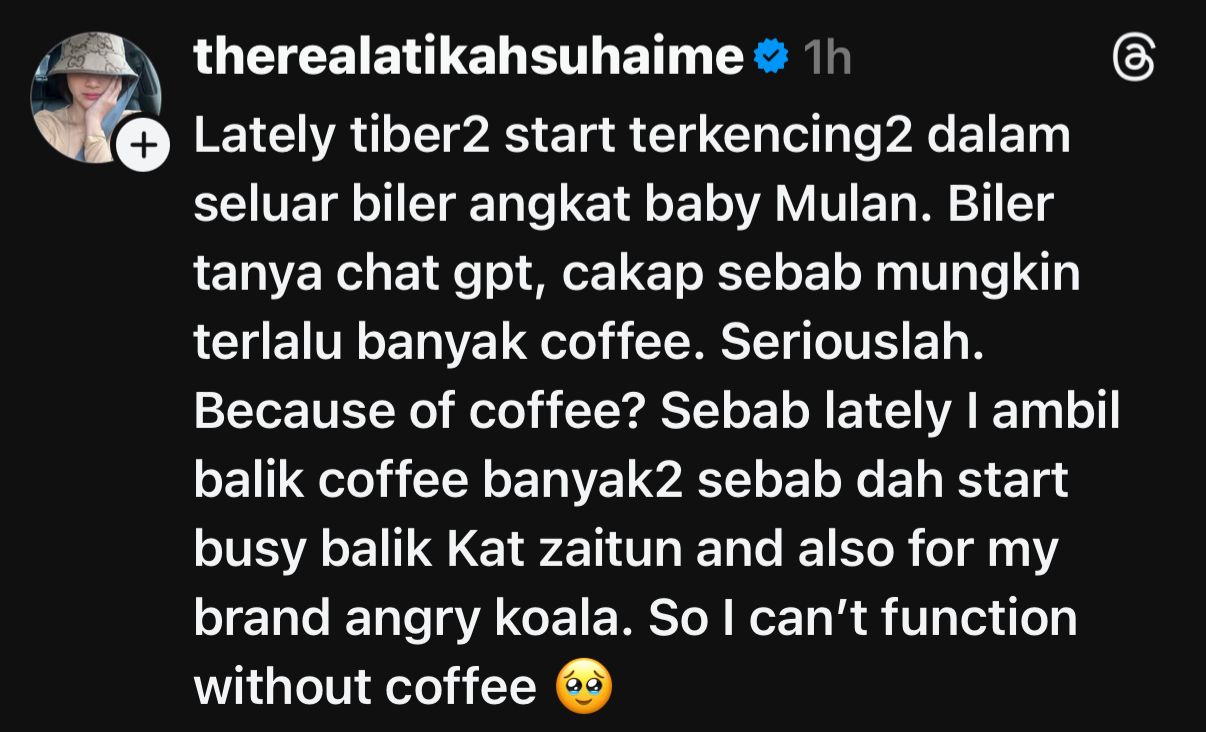 "Baru-baru ini saya mula terkencing dalam seluar selepas sahaja angkat Mulan. Bila saya tanya chatGPT, dia cakap sebab kemungkinan terlalu banyak minum kopi," tulisnya.
