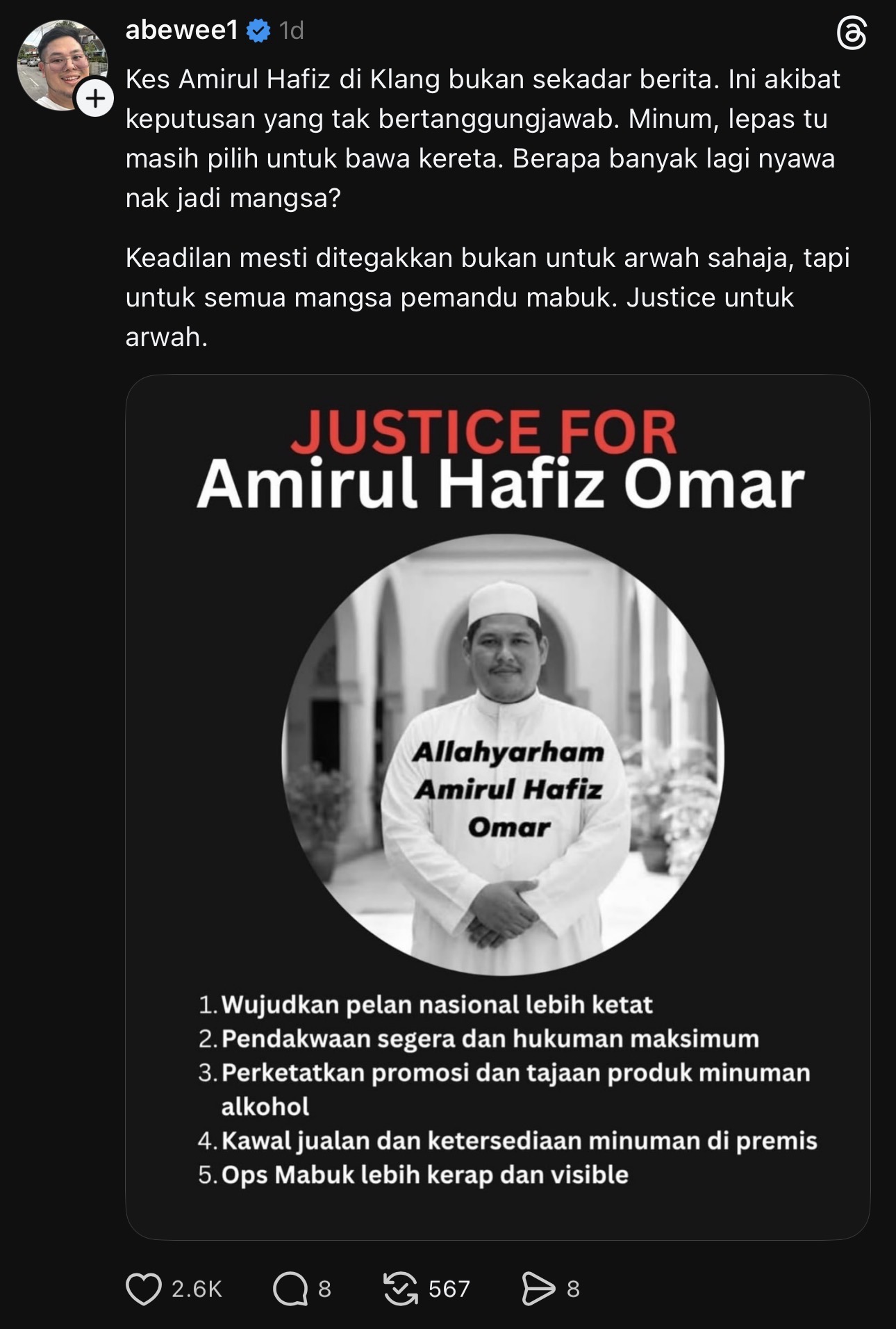 Menerusi hantaran di Threads, Abewee berkata insiden itu tidak seharusnya dilihat sebagai berita biasa, sebaliknya harus dijadikan peringatan serius kepada masyarakat mengenai bahaya memandu di bawah pengaruh alkohol.