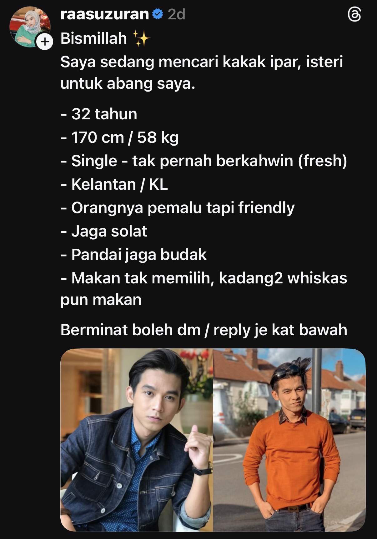 "Bismillah, saya sedang mencari kakak ipar, isteri untuk abang saya," tulisnya.