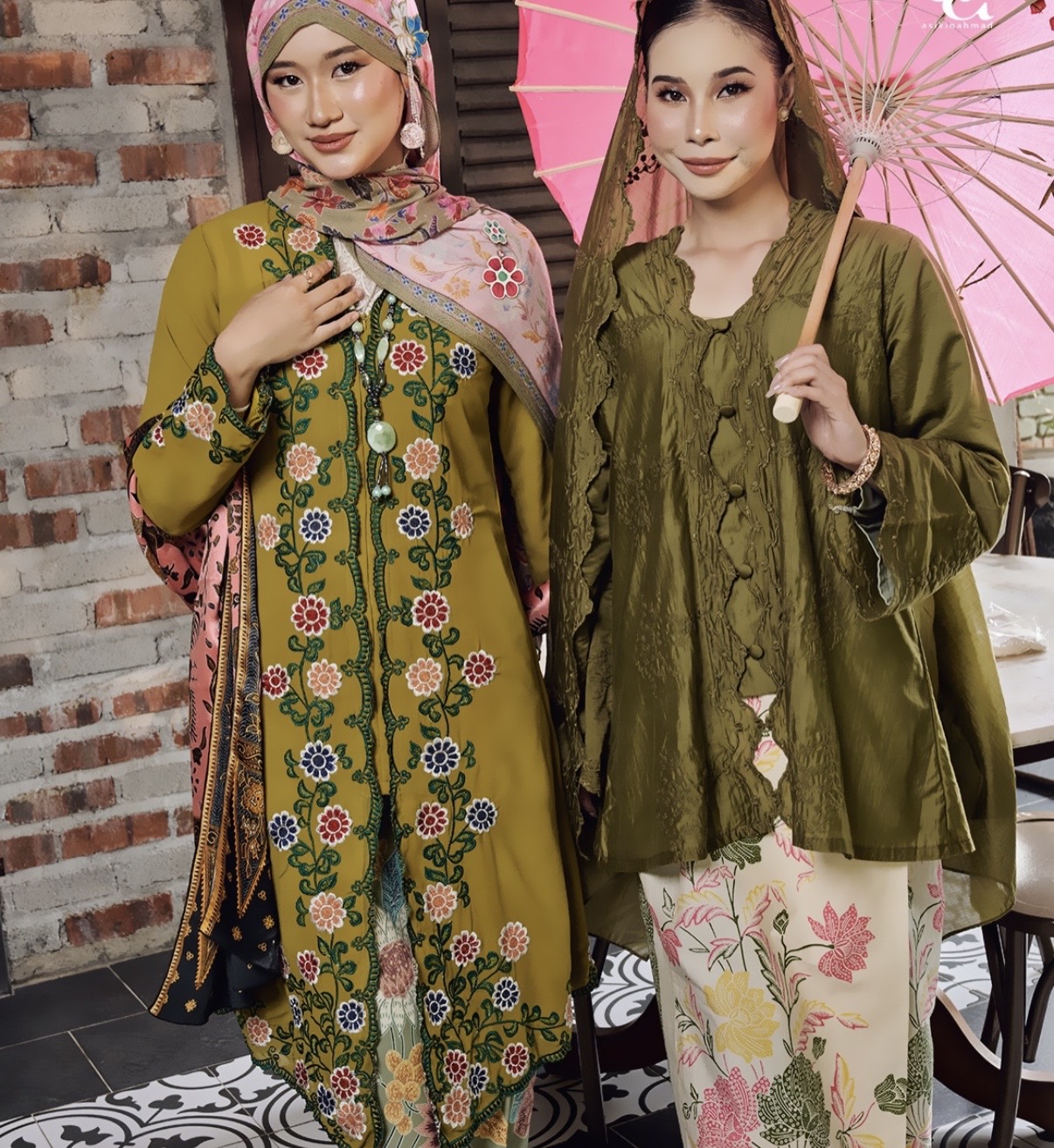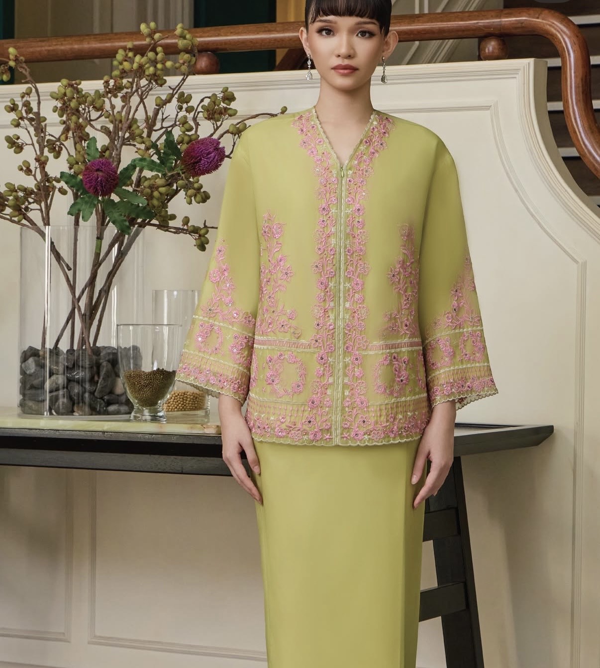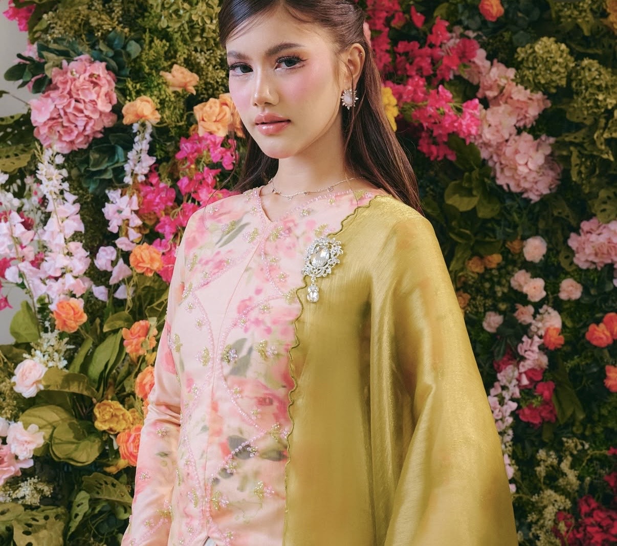 Busana tradisional Melayu dengan sentuhan moden dalam rona hijau lembut. Hiasan sulaman dan corak bunga berwarna-warni dipadankan dengan kain floral, menyerlahkan sisi feminin dan klasik.