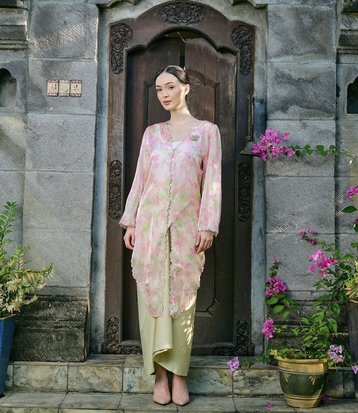 Kebaya floral ringan seperti kelopak bunga yang bergerak lembut. Sulaman di garis leher dan hadapan menambah keunikan, manakala gabungan warna blush pink, petal lilac, dan muted green memberi aura romantis. Manakala, Pareo satin Sage Green melengkapkan rekaan tersebut.