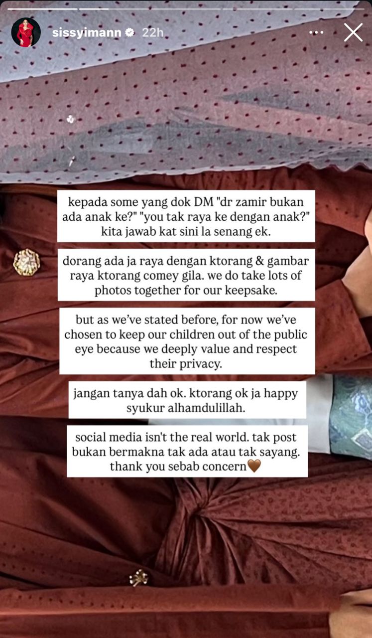 "Mereka ada sahaja beraya dengan kami dan gambar raya kami comel gila. Kami ada ambil gambar bersama untuk disimpan, tetapi macam yang saya cakap sebelum ini, buat masa sekarang kami tak mahu dedahkan anak-anak kami secara terbuka sebab kami sangat mementingkan dan menghormati privasi mereka.