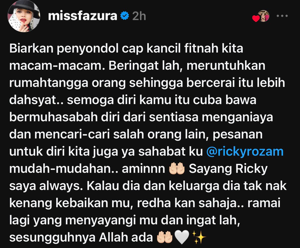 "Pesanan untuk diri kita juga ya sahabat ku @rickyrozam. Sayang sentiasa Ricky saya. Kalau dia dan keluarga dia tak nak kenang kebaikan kamu, redha kan sahaja. Ramai lagi yang menyayangi mu dan ingat lah, sesungguhnya Allah ada," ujarnya.