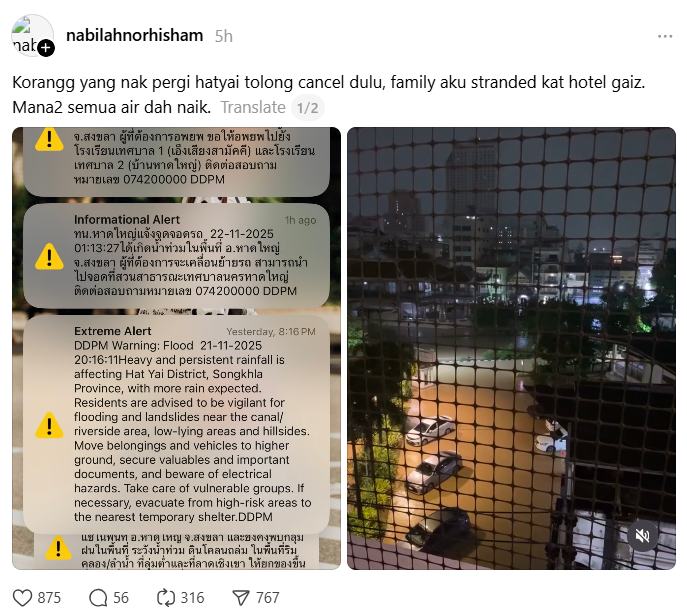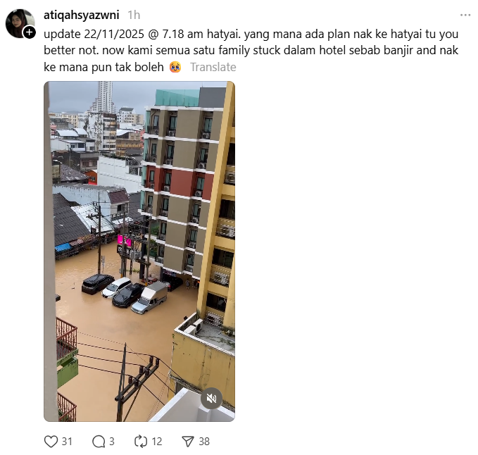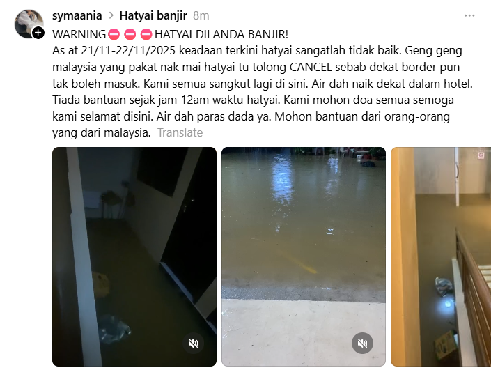 “Korang yang nak pergi Hatyai tolong batalkan dulu. Keluarga aku terkandas kat hotel. Mana-mana semua air dah naik.