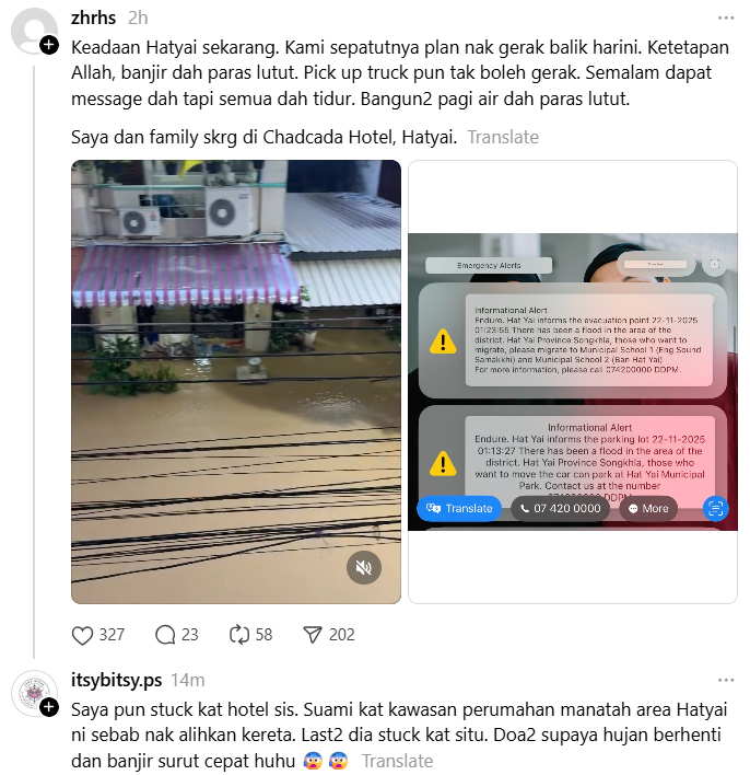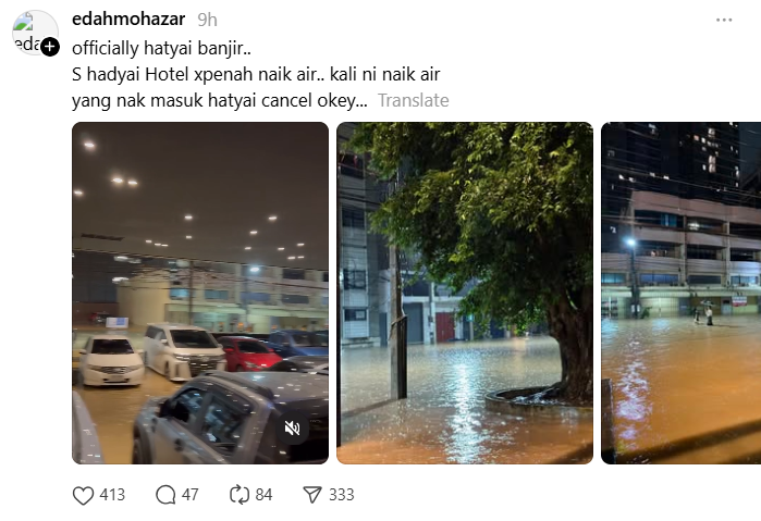 Seorang pengguna Thread, Nabilah Norhisham, memaklumkan bahawa dia dan keluarganya tidak dapat keluar dari hotel akibat paras air yang semakin meningkat.