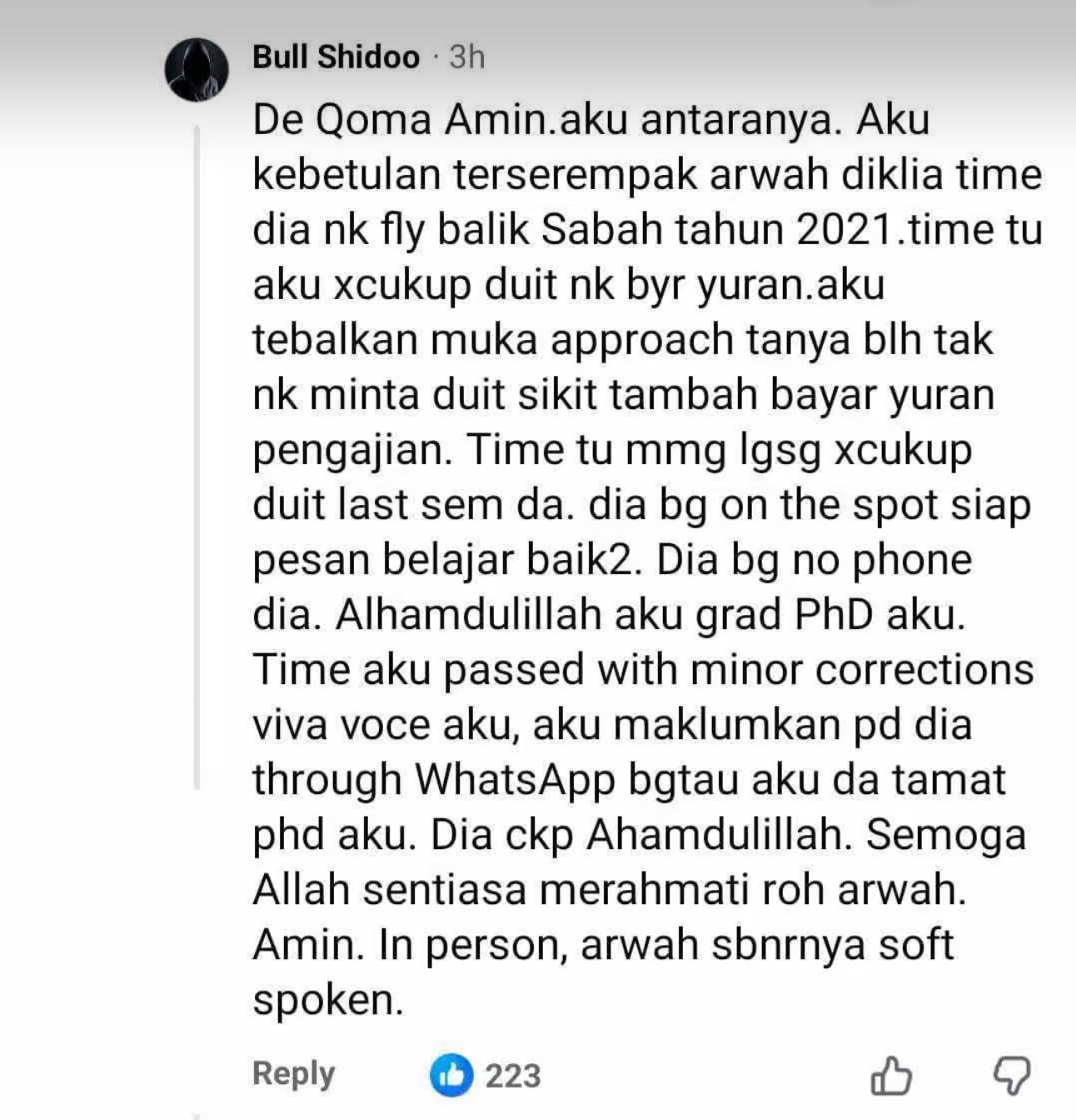 - Seorang individu berkongsi pengalaman mendapat bantuan kewangan daripada arwah untuk menampung yuran pengajian sehingga berjaya menamatkan PhD.