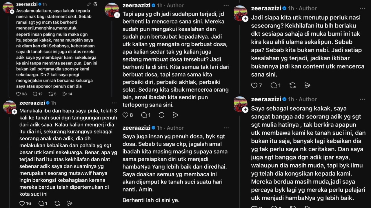 - Zeera menjelaskan bahawa mereka menunaikan umrah hasil tajaan penuh Neera tanpa meminta bayaran dan niat video itu hanyalah untuk berkongsi kebahagiaan.