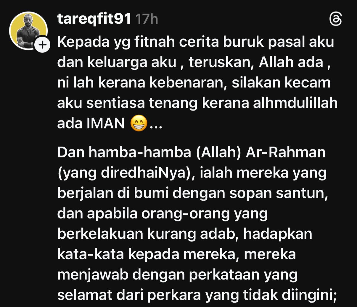 Menerusi perkongsian di Threads, Tareq menegaskan dia tidak teragak-agak dengan setiap tindakannya kerana percaya ia dilakukan demi kebenaran dan kebaikan masyarakat, khususnya umat Islam.