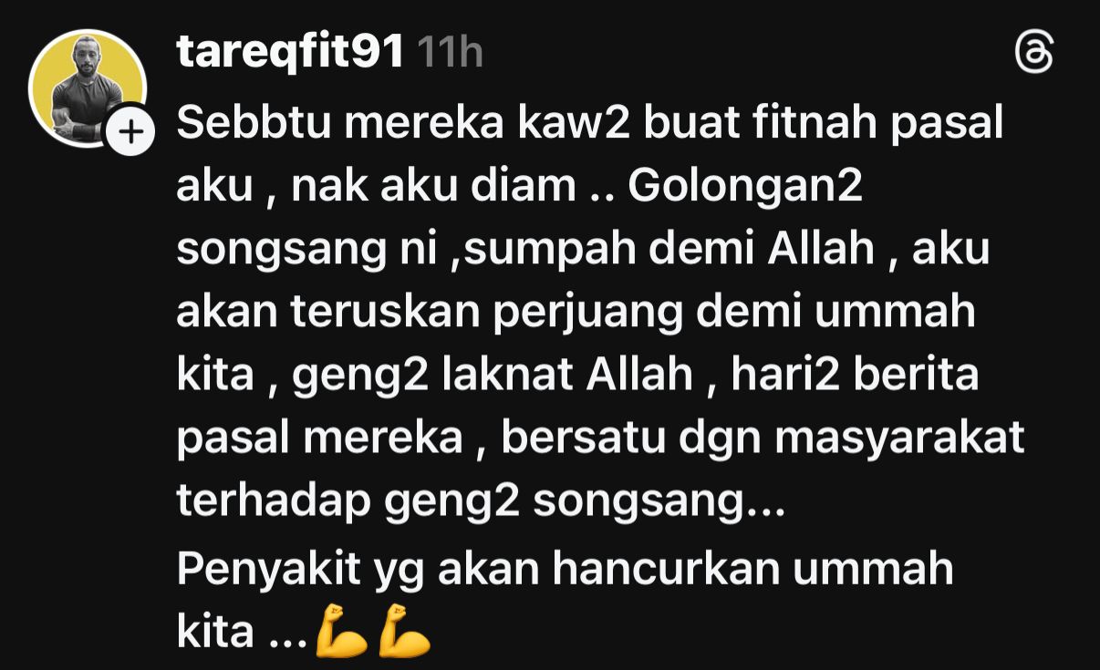 "Sebab itu golongan songsang beria buat fitnah pasal aku, supaya aku diam. Sumpah demi Allah, aku akan teruskan perjuangan demi ummah kita, geng laknat Allah. Hari-hari berita pasal mereka. Bersatu dengan masyarakat terhadap geng songsang. Penyakit ini akan hancurkan ummah," ujarnya.
