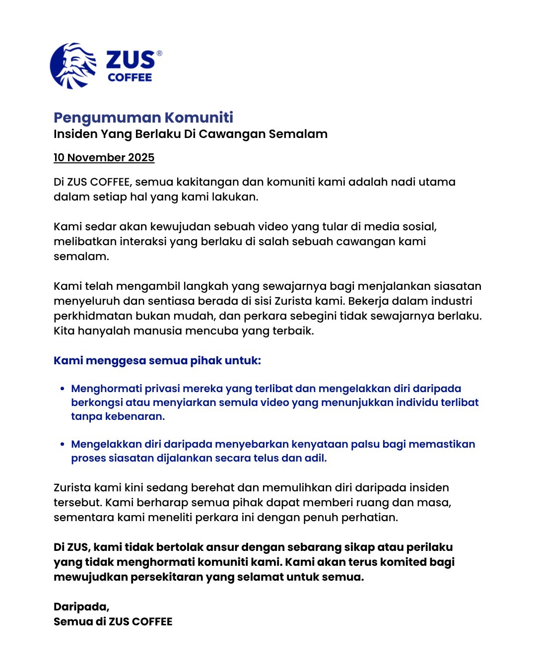 - ZUS Coffee menegaskan pentingnya menghormati privasi individu dan mengelak daripada menyebarkan video atau maklumat palsu.