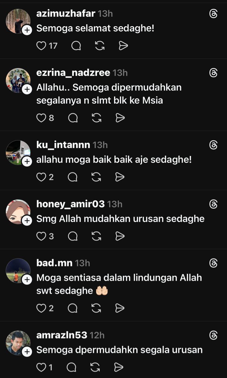 "Tolong doakan kami ya sedaghe. Penerbangan terpaksa dibatalkan saat akhir, susulan khabar peperangan yang mula bergegar. Semoga kita semua berada di bawah lembayung-Nya," tulisnya.