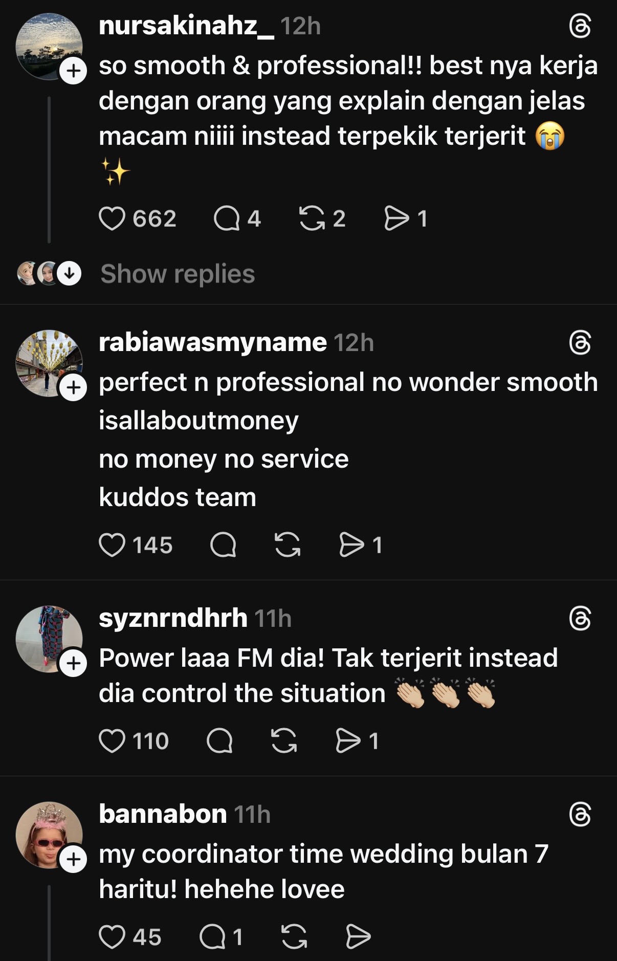 Menjengah ke ruangan komen, rata-rata netizen memuji cara pengendalian wanita berkenaan yang disifatkan profesional, tersusun serta menawarkan perkhidmatan pengurusan majlis yang cemerlang.