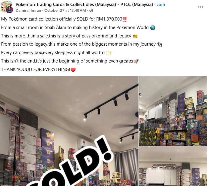 “Koleksi kad Pokemon saya secara rasminya terjual pada harga RM1.87 juta. Dari sebuah bilik kecil di Shah Alam hingga berjaya mencipta sejarah dalam dunia Pokemon.