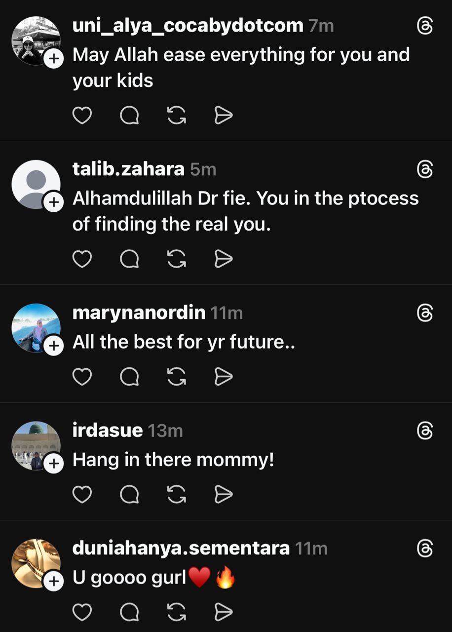 Menjengah ke ruangan komen, rata-rata netizen memberikan kata-kata semangat buat Dr Fie dan mendoakan agar kehidupannya dan anak-anak sentiasa dipermudahkan.