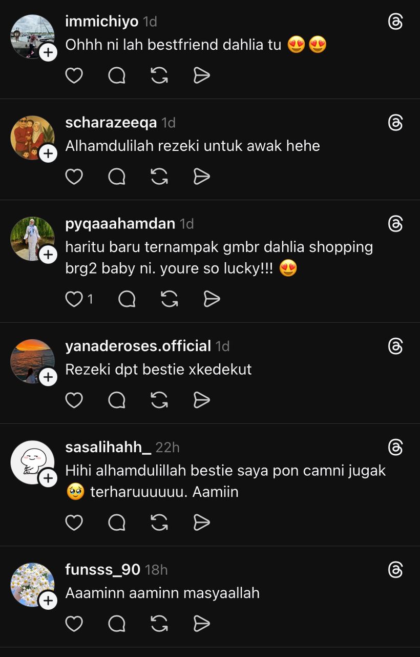 - Netizen memuji sifat pemurah Dahlia dan menganggap Adibah sebagai rakan yang sangat bertuah.