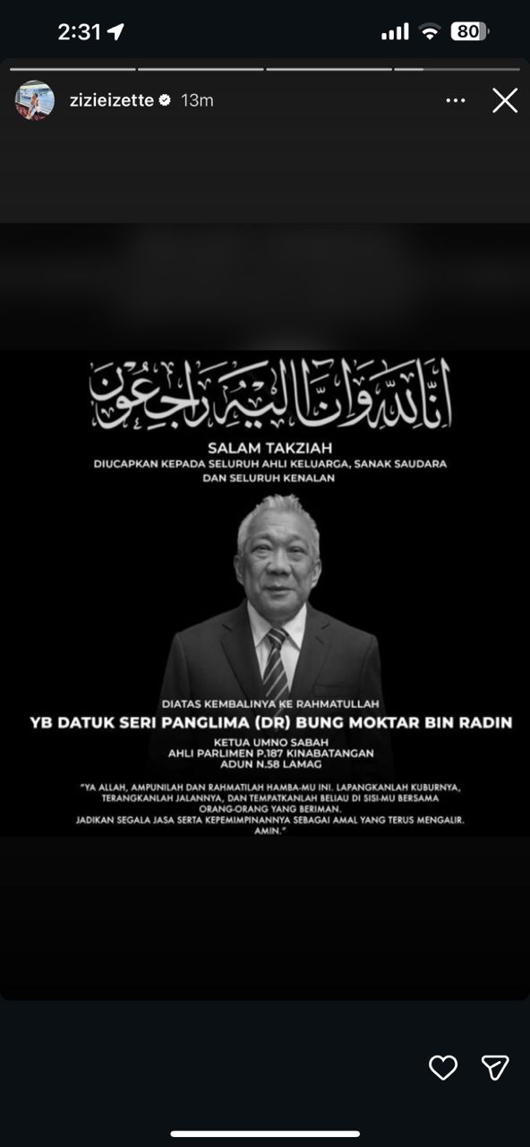Beberapa jam sebelum berita itu dikongsikan kepada khalayak, Zizie sempat memuat naik beberapa siri video di Instagram Stories memohon doa daripada orang ramai.