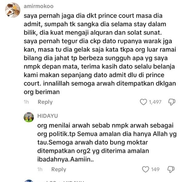 “Saya pernah jaga dia di Prince Court masa dia admit. Sumpah tak sangka, dia selama stay dalam bilik dia kuat mengaji Al-Quran dan solat sunat. Saya pernah tegur dia, cakap ‘Dato’ rupanya warak juga’.