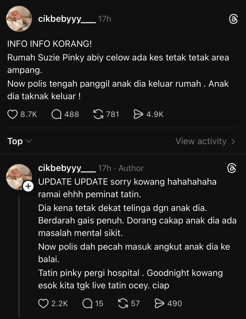 Tular sebuah video memaparkan pencipta kandungan, Datin Suzie Pinky dalam keadaan cedera selepas didakwa ditetak oleh anak lelakinya yang dikenali sebagai Abi Celow.