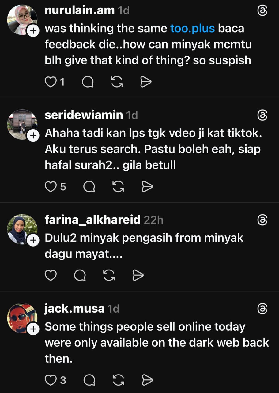"Apa sebenarnya isi kandungan minyak itu dan bagaimana orang kita boleh beli benda macam itu. Korang tak rasa ia menyeramkan ke," ujarnya.